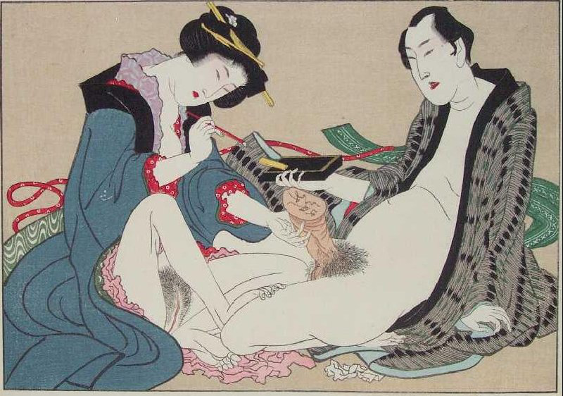 通例日本の春画では、男の場合も女の場合も、性器がこれでもかというように巨大に描かれる。